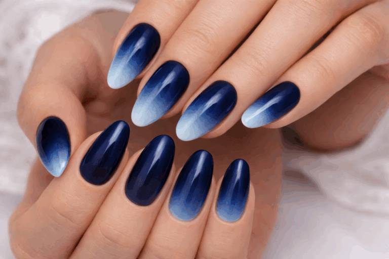 Gece mavisi ile buz mavisi arasındaki geçiş, kış gökyüzünü anımsatır. Kısa veya uzun tırnaklarda işlevsel olan bu tasarım, uçlarda gümüş sim ile güçlendirilebilir. Şıklığı kaybetmeden festif bir dokunuş isteyenler için idealdir.
